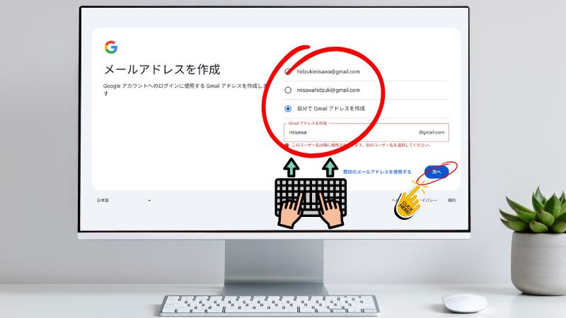 もし「そのユーザー名は既に使用されています」と出たら、誰かがすでに使っています。後ろに数字を足すなどして調整しましょう。