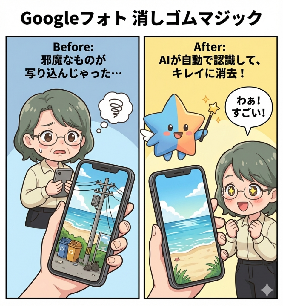 2026年最新機能の【Ask Photos】を使えば、「去年の夏休みに海で食べたアイスの写真を見せて」と話しかけるだけで、AIがパッと探してくれますよ。