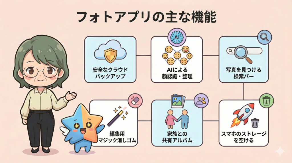 | 整理 | AIによる自動分類 | 人物や場所で勝手に分かれる 📂 |